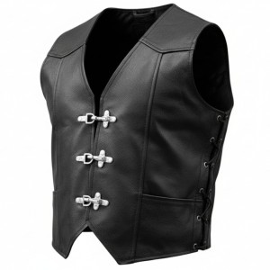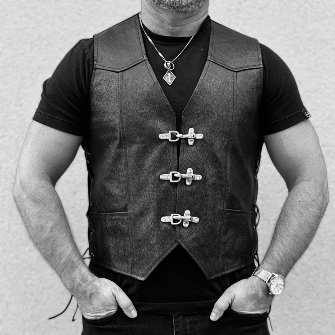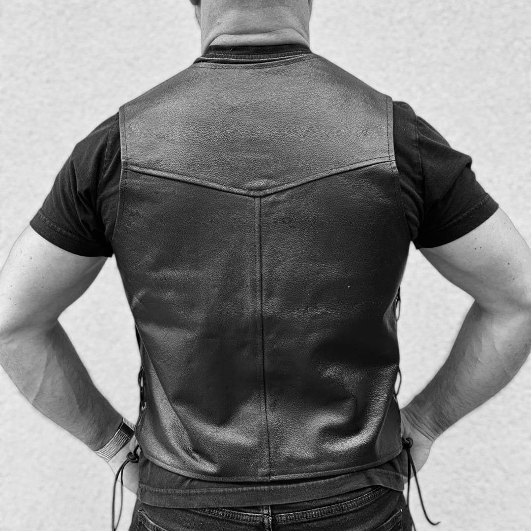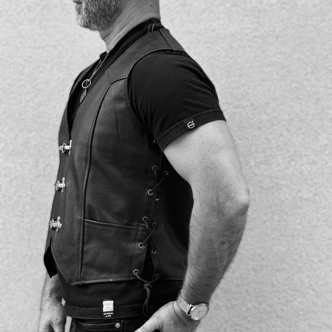 • System Bocznych Wiązań: Skórzane rzemyki po bokach pozwalają na szeroką regulację. Dzięki nim założysz kamizelkę zarówno na t-shirt, jak i na grubą kurtkę motocyklową.