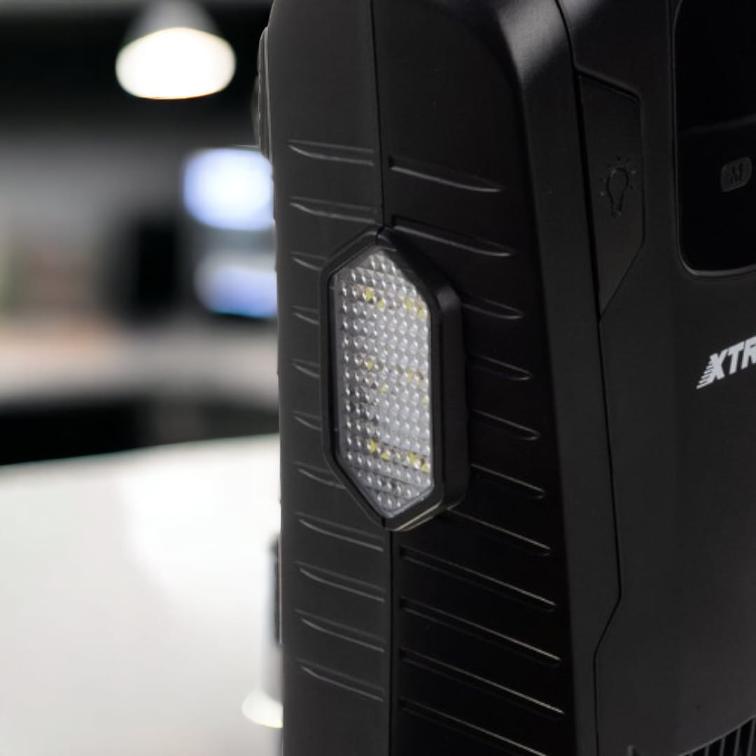 - WBUDOWANY PANEL STEROWANIA: wyposażony w manometr, wyłącznik i latarkę. Bardzo prosty w obsłudze i kompaktowy. Niezbędny wszędzie tam gdzie ilość miejsca jest ograniczona. Dodatkowo wyposażony w wygodny, wybudowany uchwyt co znacznie ułatwia jego przemieszczanie. Elektroniczny manometr z wyświetlaczem wyłącza kompresor osiągnięciu zadanego ciśnienia.