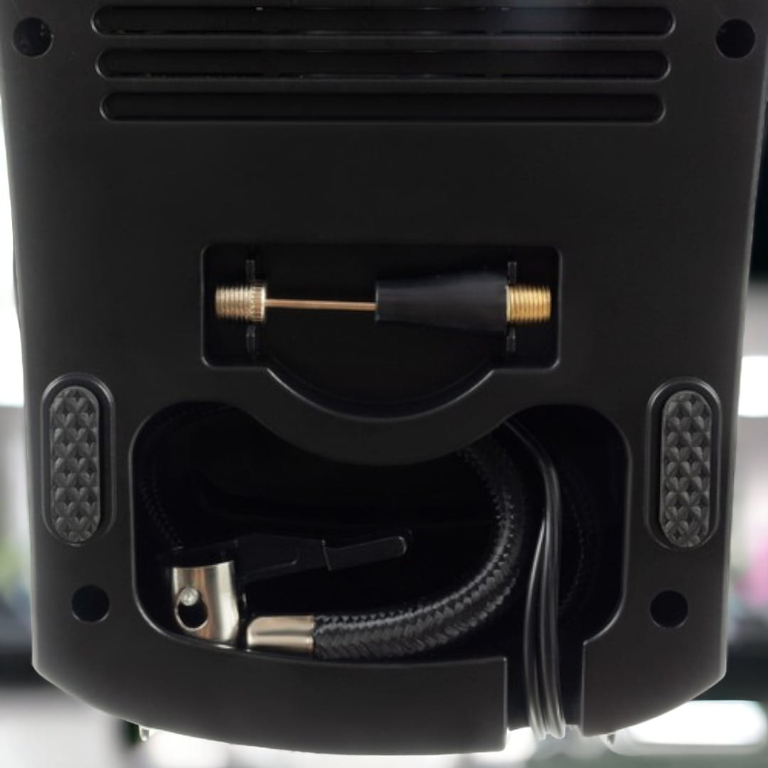 - SAMOCHODOWY: pompka posiada przewód DC 12V o długości 2,8m, oraz wąż ciśnieniowy o długości 47 cm, zakończony zaciskową końcówką do pompowania kół samochodów i motocykli. Urządzenie posiada również latarkę, dzięki której podczas nocnej awarii nie zabraknie Ci światła.
