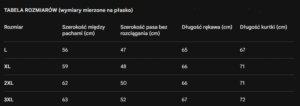 Kurtka mierzona jest na płasko, bez rozciągania ściągaczy. Dzięki elastycznemu wykończeniu w pasie, kurtka zyskuje dodatkową tolerancję i swobodę, co sprawia, że łatwiej dopasowuje się do różnych typów budowy ciała.