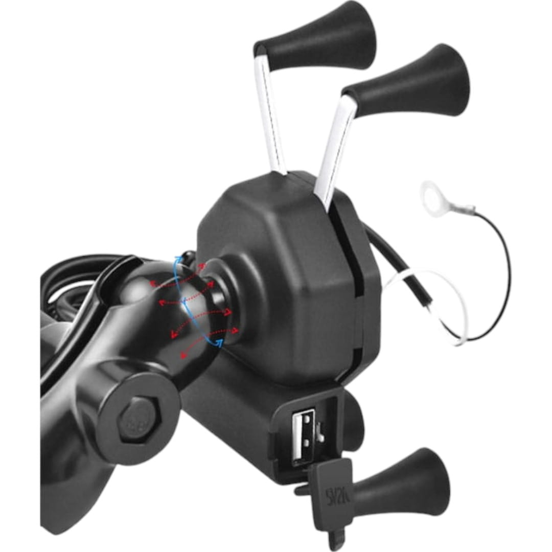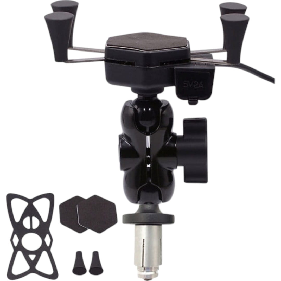 - Uchwyt typu RAM z 4 ramionami zakończonymi gumowymi chwytakami, ładowarką USB i kablem: Główny element zestawu - solidny uchwyt z czterema ramionami, które posiadają gumowe chwytaki zapewniające pewne trzymanie urządzenia. Dodatkowo zawiera ładowarkę USB, oraz kabel 150cm