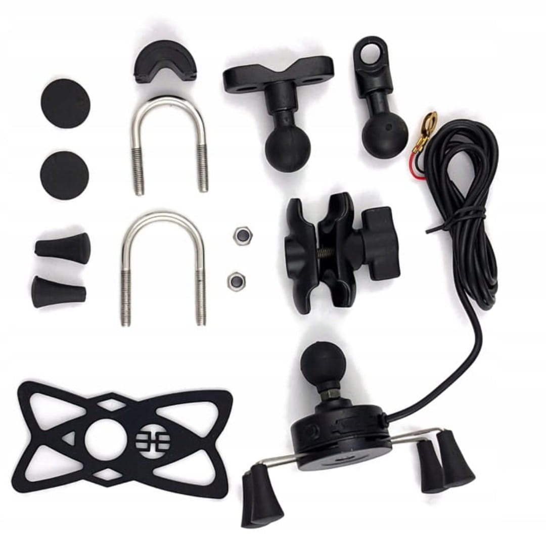 - Uchwyt typu RAM z 4 ramionami zakończonymi gumowymi gripami, ładowarką USB, włącznikiem i kablem