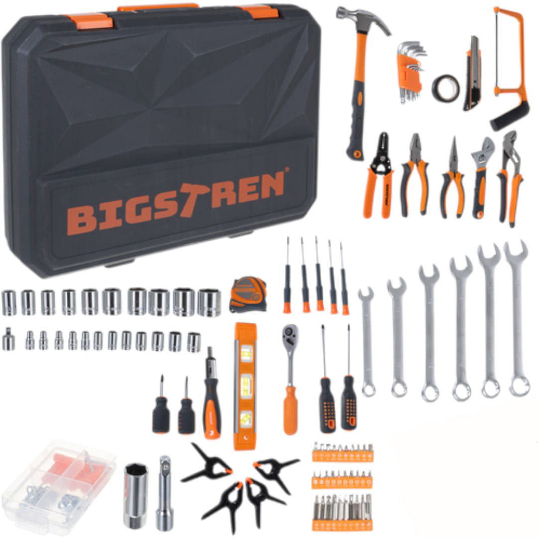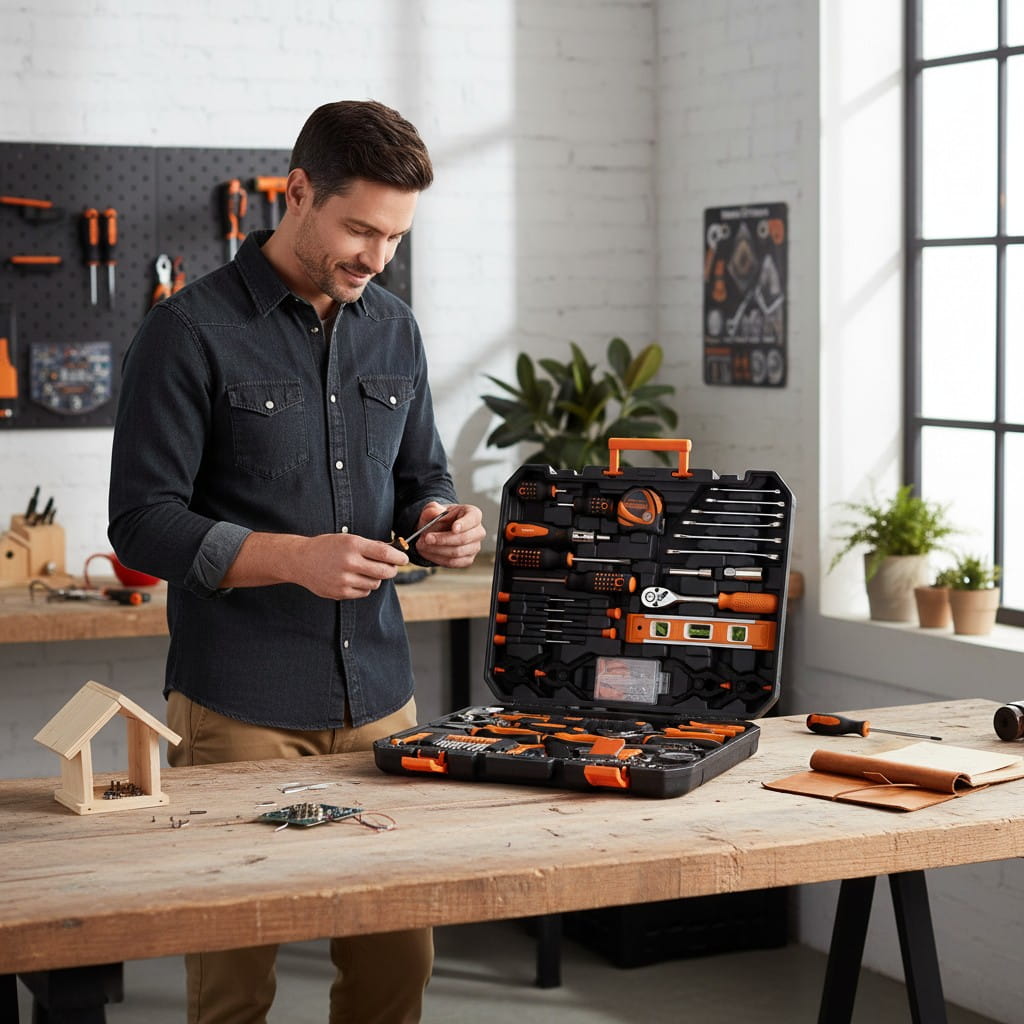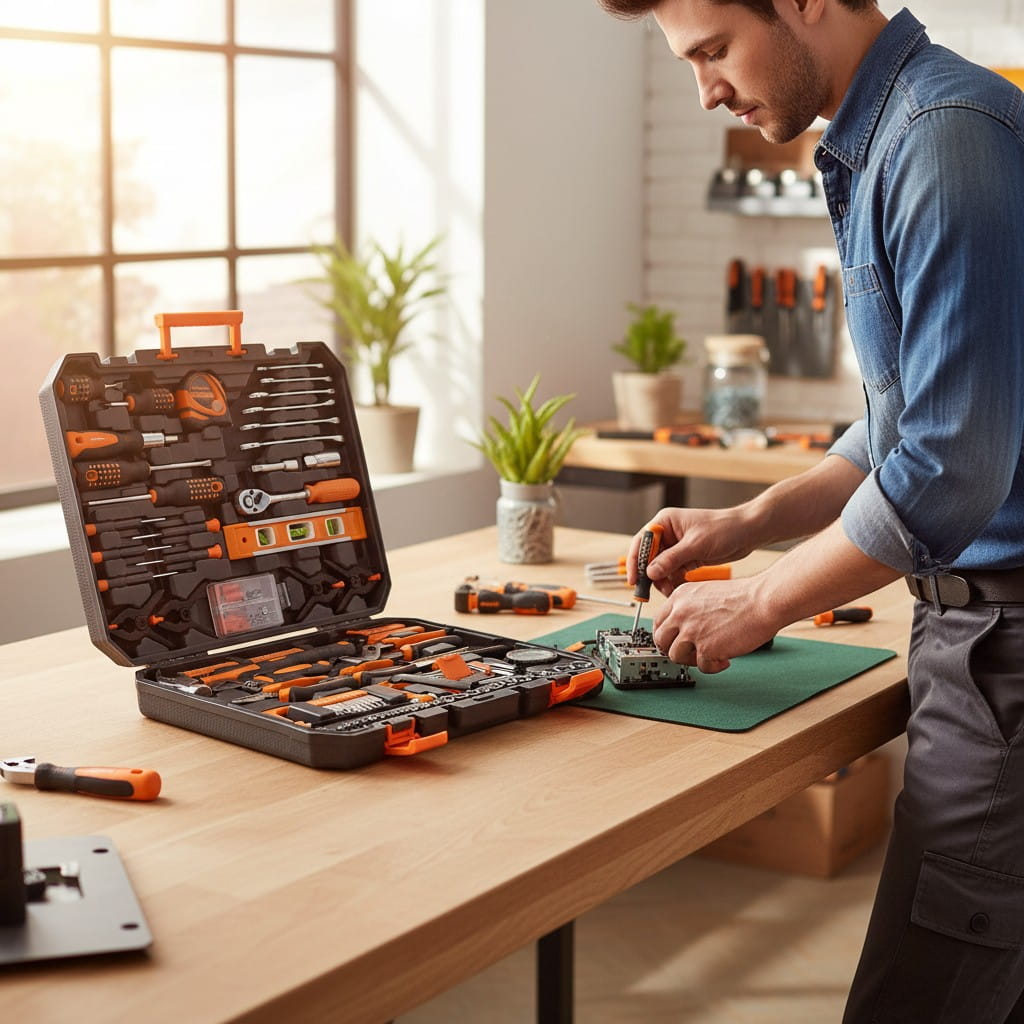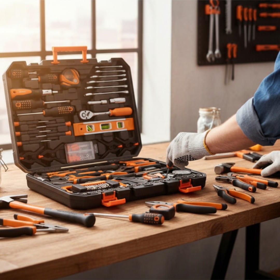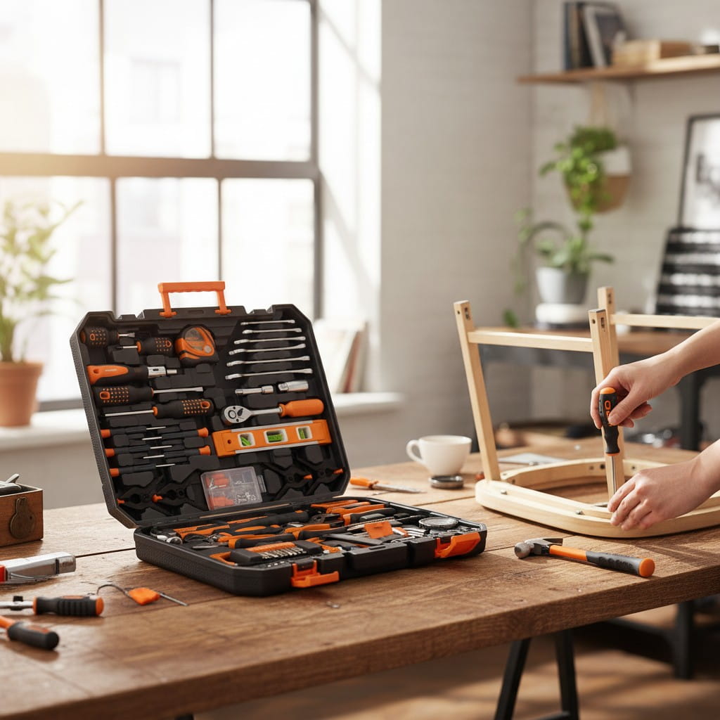 ✔ Komplet kluczy imbusowych, płaskich, szczypiec, młotka, miarki, poziomicy oraz licznych bitów i nasadek – pełna gotowość do większości prac.